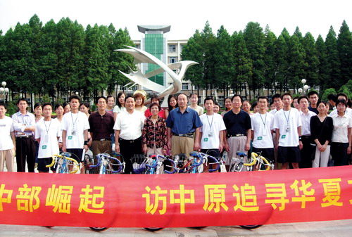 党委副书记高建社(前中)为参加暑期社会实践活动的大学生送行