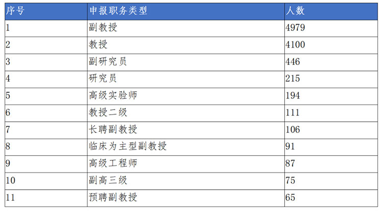 11528位参评人员的职务类型,仍然以传统分类的副教授、教授为主。其中副教授占比(43.19%)、教授(35.57%)、副研究员(3.87%)、3个类型位列前3。同时,高校参评的职务类型划分越来越多元、越细致。出现了将近200个不同类型,如有91位参评临床为主的副教授,还有社会服务型、国防军工类、教授(破格)、临床教研型、卫技系列、教授级高级工程师(畜牧师)、应用推广型、国际轨教师、资深讲师晋升副教授等诸多较为新的类型开始增多。说明一些高校职在称评审的分类评价方面开始的进行创新和探索。
