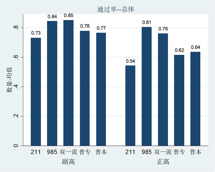 正高层面。通过率最高的为原985高校,为0.81。普通本科、普通专科分别为0.64和0.62。最低为原211高校,仅为0.54。总体来看。各类高校的副高职称的通过率要高于正高职称。副高层面。通过率最高为985高校,分别为0.85和0.84;其次为普通专科与普通本科,分别为0.78和0.77;最低的为原211高校,为0.73。原211高校的副高与正高通过率之差最大,为0.19;其次为普通专科和普通本科,分别为0.16和0.13。原985高校副高和正高的通过率基本持平。