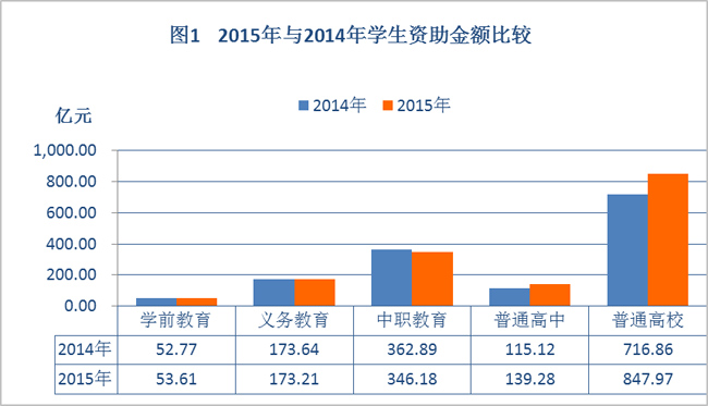 2015年,全国累计资助学前教育、义务教育、中职学校、普通高中和普通高校学生(幼儿)8433.311万人次(不包括义务教育免费教科书和营养膳食补助),与上年基本持平;累计资助金额1560.25亿元,比上年增加138.97亿元,增幅9.78%。自2007年我国着力构建国家学生资助政策体系以来,资助资金连续九年保持高速增长。