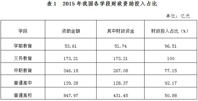 财政资金占当年资助资金(不含免费教科书和营养膳食补助)比例为67.42%,财政投入是国家学生资助经费的主要来源,政府发挥了主导作用。其中,中央财政投入占2015年资助总额的35.85%;地方财政投入占2015年资助总额的31.56%。学前教育财政资金投入51.74亿元,占学前资助总额的96.51%;义务教育寄宿生生活补助均为财政资金;中职教育财政资金投入267.08亿元,占中职资助总额的77.15%;普通高中财政资金投入128.37亿元,占普通高中资助总额的92.17%;普通高校财政投入431.45亿元,占普通高校资助总额的50.88%。