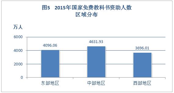 2015年,全国约1.24亿学生享受到国家免费教科书政策平均覆盖率为89.85%。其中,西部地区共资助3696.01万人,覆盖率为90.03%;中部地区共资助4631.93万人,覆盖率为87.87%;东部地区共资助4096.06万人,覆盖率为92.03%。
