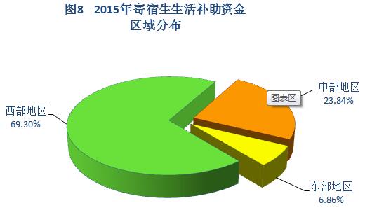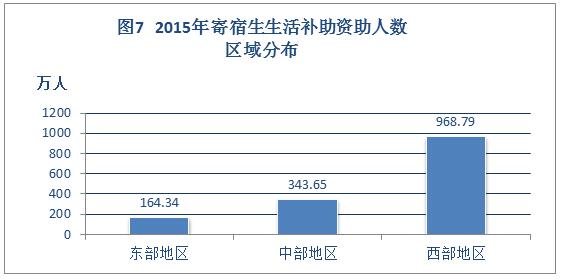 2015年,全国共有1476.78万家庭经济困难寄宿生享受生活费补助政策,政策覆盖率为51.84%。其中,西部地区968.79万人,覆盖率(占该地区寄宿生总数)达79.52%;中部地区343.65万人,覆盖率29.19%;东部地区164.34万人,覆盖率36.28%。