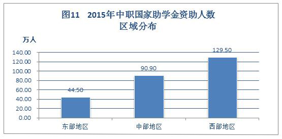 2015年,地方政府在落实国家免学费、国家助学金政策的基础上,另外共资助中等职业学校学生21.28万人。其中,西部地区资助14.52万人,占68.23%;中部地区资助4.15万人,占19.50%;东部地区资助2.60万人,占12.22%。