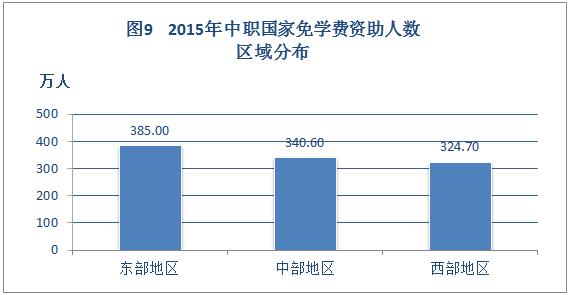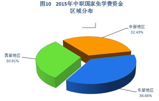2015年,全国1050.30万中等职业学校学生享受免学费政策,其中,西部地区324.70万人,占享受免学费资助学生总数的30.91%;中部地区340.60万人,占32.43%;东部地区385.00万人,占36.66%。