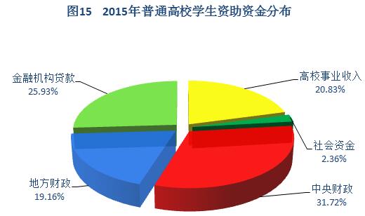针对普通高校学费标准调整和研究生教育收费制度改革全面实施,我国重点加大了对普通高校学生特别是研究生的资助力度,切实减轻了学生家庭的经济负担。2015年普通高校资助资金大幅增长:国家助学贷款比上年增加52.87亿元,增幅31.66%;研究生国家助学金、学业奖学金、研究生“三助”比上年分别增加50.43亿元、31.36亿元、7.49亿元。