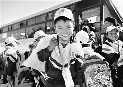 目前,西藏日喀则市对桑珠孜区寄宿制中小学校学生进行分时分片接送,解决了7000多名学生的安全上下学问题。图为甲措雄中心小学的寄宿学生准备乘坐校车回家。
