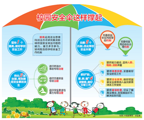 二是完善两个机制,优化学校安全环境。要完善校园安全风险管控机制,全面落实安全管理责任,形成职责明确、风险可控的管理格局,安全责任全员化、全覆盖。要完善校园周边综合治理机制,建立学生安全区域制度,进一步健全警校合作机制,严厉打击涉及学校和学生安全的违法犯罪行为,为学校正常教育教学创造良好的外部环境。