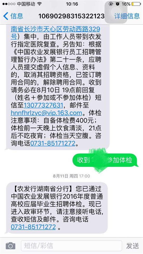 农发行短信告知毕业生通过了招聘体检。