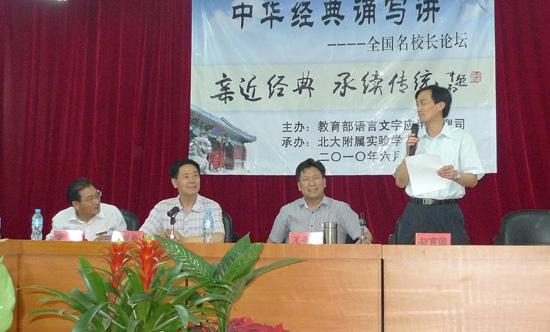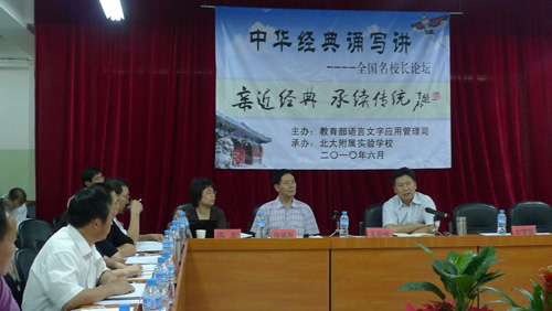 为了进一步推广普通话,规范汉字书写,提高学生综合素养,服务于人力资源强国建设,2010年6月20—21号,教育部、国家语委组织了“中华经典诵写讲—全国名校长论坛”研讨会。 本次研讨会由教育部语用司主办,北大附属实验学校承办,参会人员主要有教育部领导、山东教育社、天津教科院、山东潍坊教科院等单位的经典教育专家,以及来自北京、天津、山东、河南、河北等地十多所中小学的名校长。 整个研讨会气氛活跃,各位校长对他们经典教育方面取得的成果做了详细而全面的报告。本次研讨会以“中华经典诵写讲”为中心,对教育部2007年以来的“中华诵”、“中华赞”的经典教育成果作了系统的总结汇报,对经典教育的背景、目的、价值等作了系统性的论述,围绕经典的“诵”、“写”、“讲”提出了许多开创性的建议。 教育部语用司司长、国家语委副主任王登峰听取了大家的报告和建议。教育专家陶继新老师、天津教科院薛永宽教授、山东潍坊教科院薛炳群教授对“中华经典诵写讲”活动提供了许多理论指导。来自全国各地的十多位名校长做了精彩的报告,他们带领的学校都响应教育部、国家语委“亲近经典,承续传统”的号召,在经典教育实践方面取得了丰硕的成果。 研讨会最后,来自全国十多所名校的校长向全国中小学联合发出了“中华经典诵写讲”的倡议,希望全国中小学校亲近经典、传承文明,让经典真正走进校园,走进课堂。 本次研讨会对“中华经典诵写讲”提出了系统的理论指导,为经典教育实践指明了方向,为经典教育可持续发展提供了宝贵的经验。