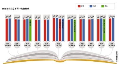 记者注意到,包括中国人民大学、北京师范大学在内,已经公布一本提档线的10余所高校中,在京本科一批提档线都呈“文理普降”的态势。