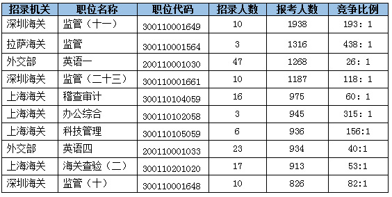 从表1可以发现,海关包揽了10大岗位中的8个,但是如此大的竞争比也让不少考生望而生畏。