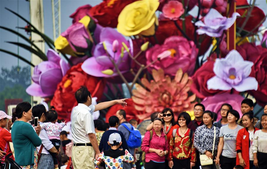 9月22日,游人在北京天安门广场正在安装的“祝福祖国”中心花坛前观赏、留影。新华社记者李欣摄