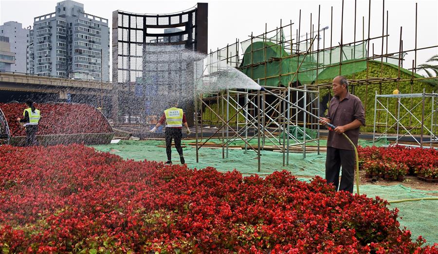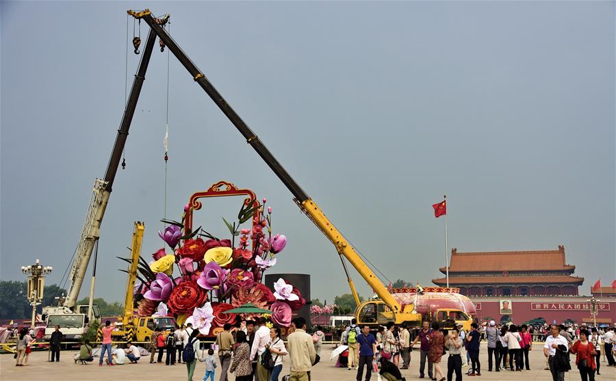 9月22日,北京天安门广场正在安装“祝福祖国”中心花坛。新华社记者李欣摄