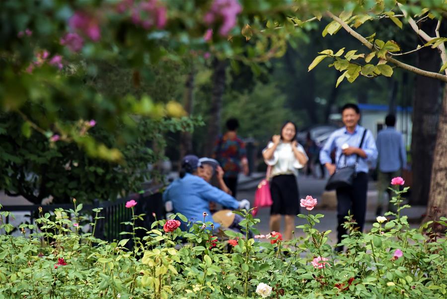 9月22日,市民在北京长安街边的街头花坛前休闲。新华社记者李欣摄