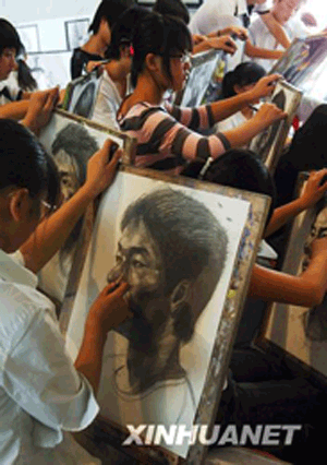资料图片:假期里的艺考族。图为2008年8月19日,一群艺考学生在合肥一培训班练习人像素描。暑假期间,来自安徽各地的许多学生来到合肥参加艺术考试培训班,强化训练专业技能,为2009年的艺术专业考试做准备。新华社记者 李健 摄