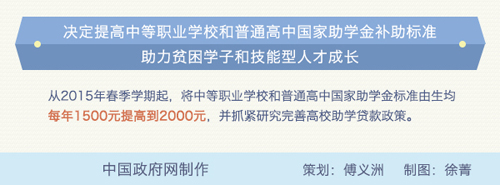 新华网北京2月25日电(记者 刘奕湛)25日召开的国务院常务会议指出,从2015年春季学期起,将中等职业学校和普通高中国家助学金标准由生均每年1500元提高到2000元,并抓紧研究完善高校助学贷款政策。
