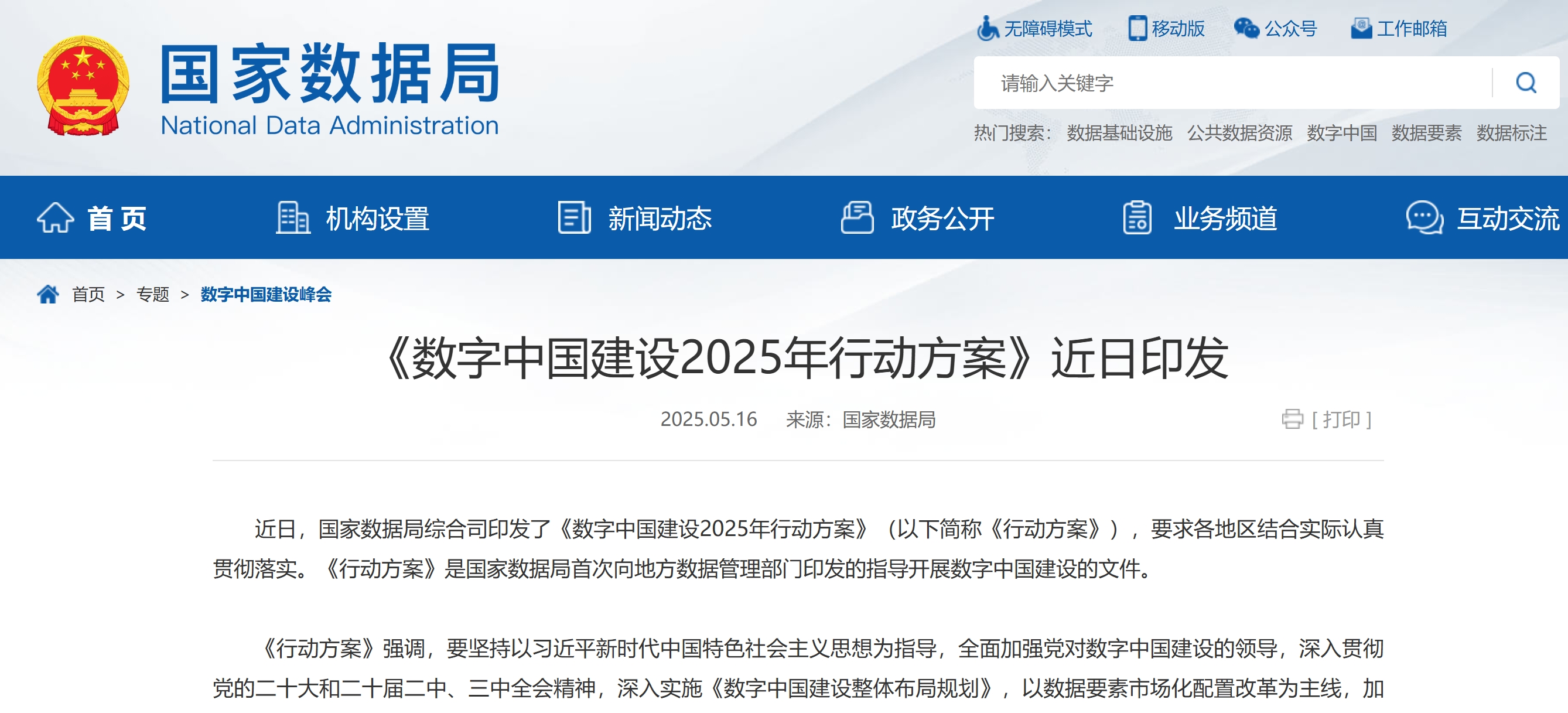 近日,国家数据局综合司印发了《数字中国建设2025年行动方案》(以下简称《行动方案》),要求各地区结合实际认真贯彻落实。《行动方案》是国家数据局首次向地方数据管理部门印发的指导开展数字中国建设的文件。