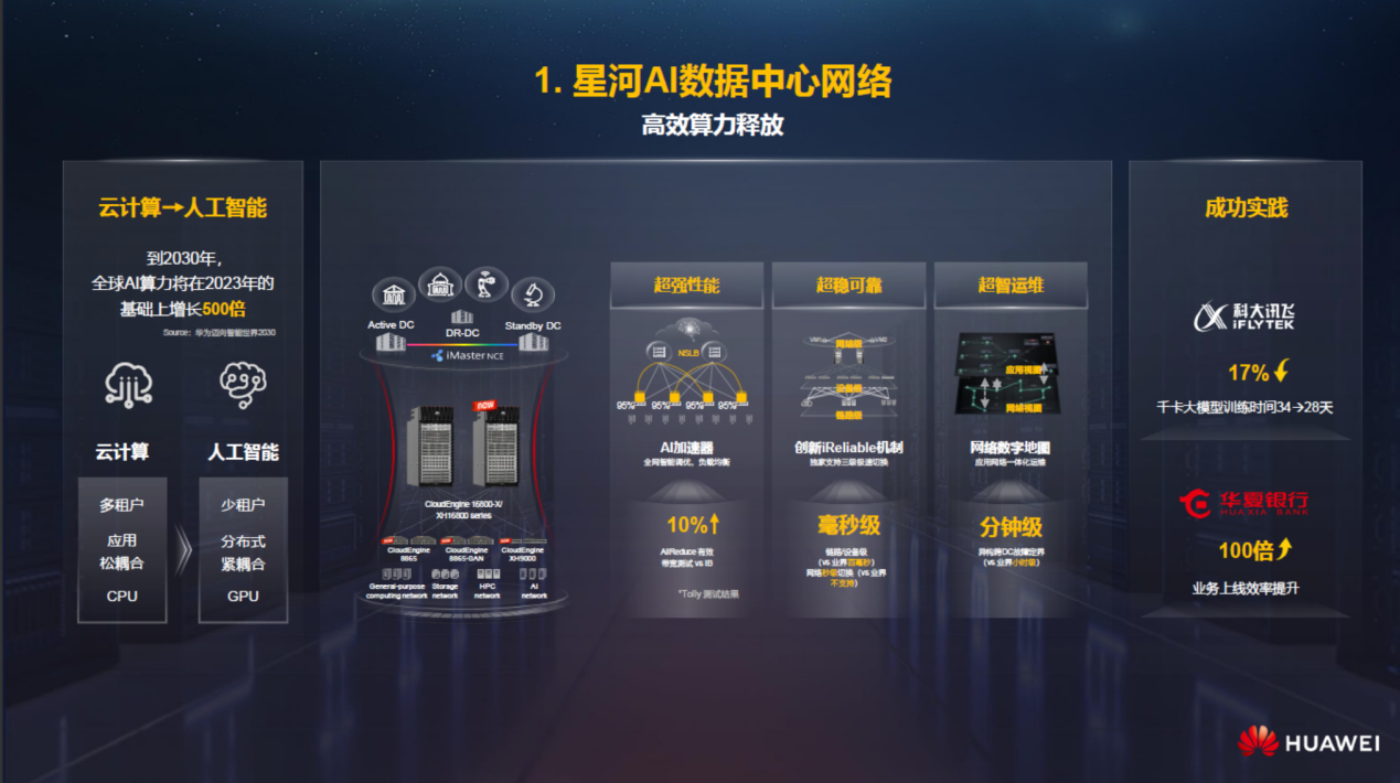 应对教育数字底座对于提升高性能计算能力的需求,华为星河AI数据中心网络解决方案针对AI时代的特性--少租户、分布式且紧耦合的应用场景,特别是GPU密集型任务--进行了优化。通过采用创新的NSLB网络级负载均衡算法,能够在不增加服务器数量的前提下,有效提升整体算力,相较于竞品在AllReduce性能上提升了10%。此外,为了保障HPC任务的连续性和可靠性,星河AI网络还引入了iReliable机制,支持亚毫秒级快切,避免因网络中断导致的训练中断,从而显著降低重训成本。运维方面,借助网络数字地图技术,实现了跨数据中心的异构故障快速定位,极大地提高了运维效率。这些技术创新不仅有助于数据中心提升HPC任务的执行效率,还能够降低总体拥有成本,为高校用户在科学研究、工程模拟等领域提供强大的算力支持。