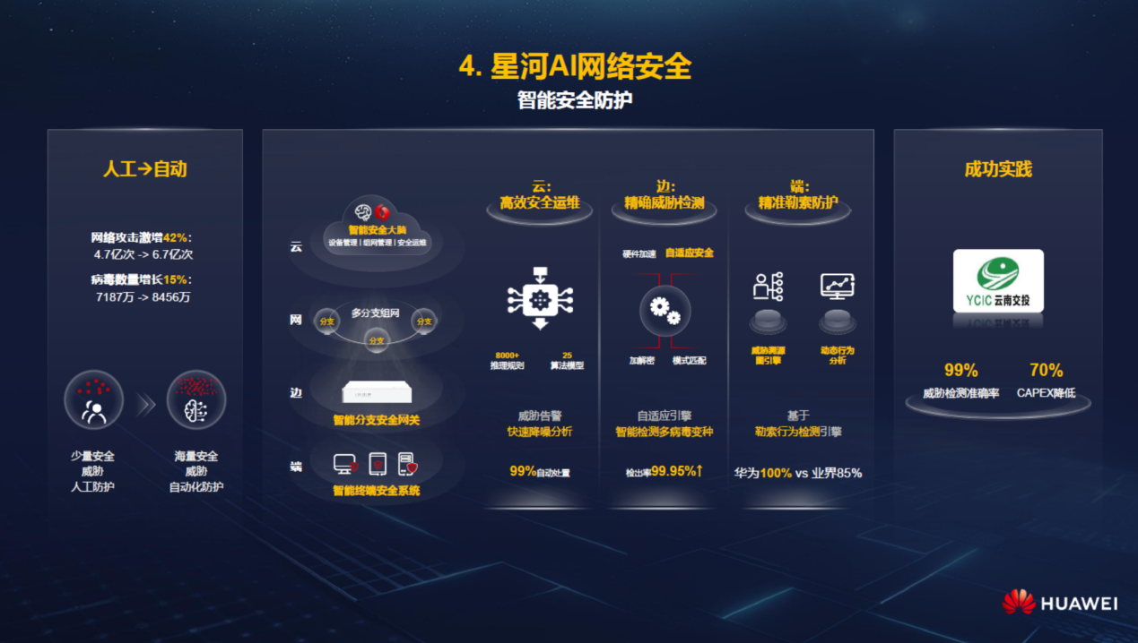 通过智能分支安全网关和智能终端安全系统,结合云端的智能安全大脑,星河AI网络形成了从边缘到云端的全方位安全防护体系,有效抵御了日益增多的安全威胁。