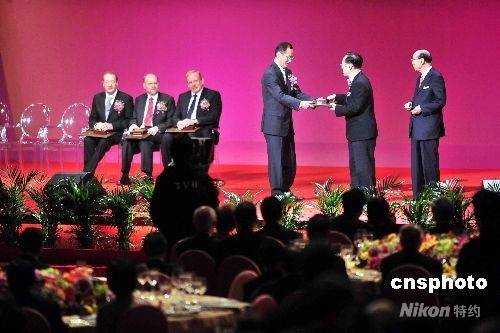 图为特首曾荫权向来自日本的山中真也教授(Professor Shinya Yamanaka)颁“生命科学与医学奖”。