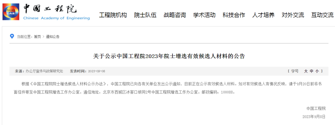 9月8日,中国工程院官网发布《关于公示中国工程院2023年院士增选有效候选人材料的公告》。公告称,根据《中国工程院院士增选候选人材料公示办法》,中国工程院已向各有关单位发出公示通知,目前正在公示有效候选人材料。如对有效候选人有情况反映,请于9月20日前将书面信件寄至中国工程院增选工作办公室。