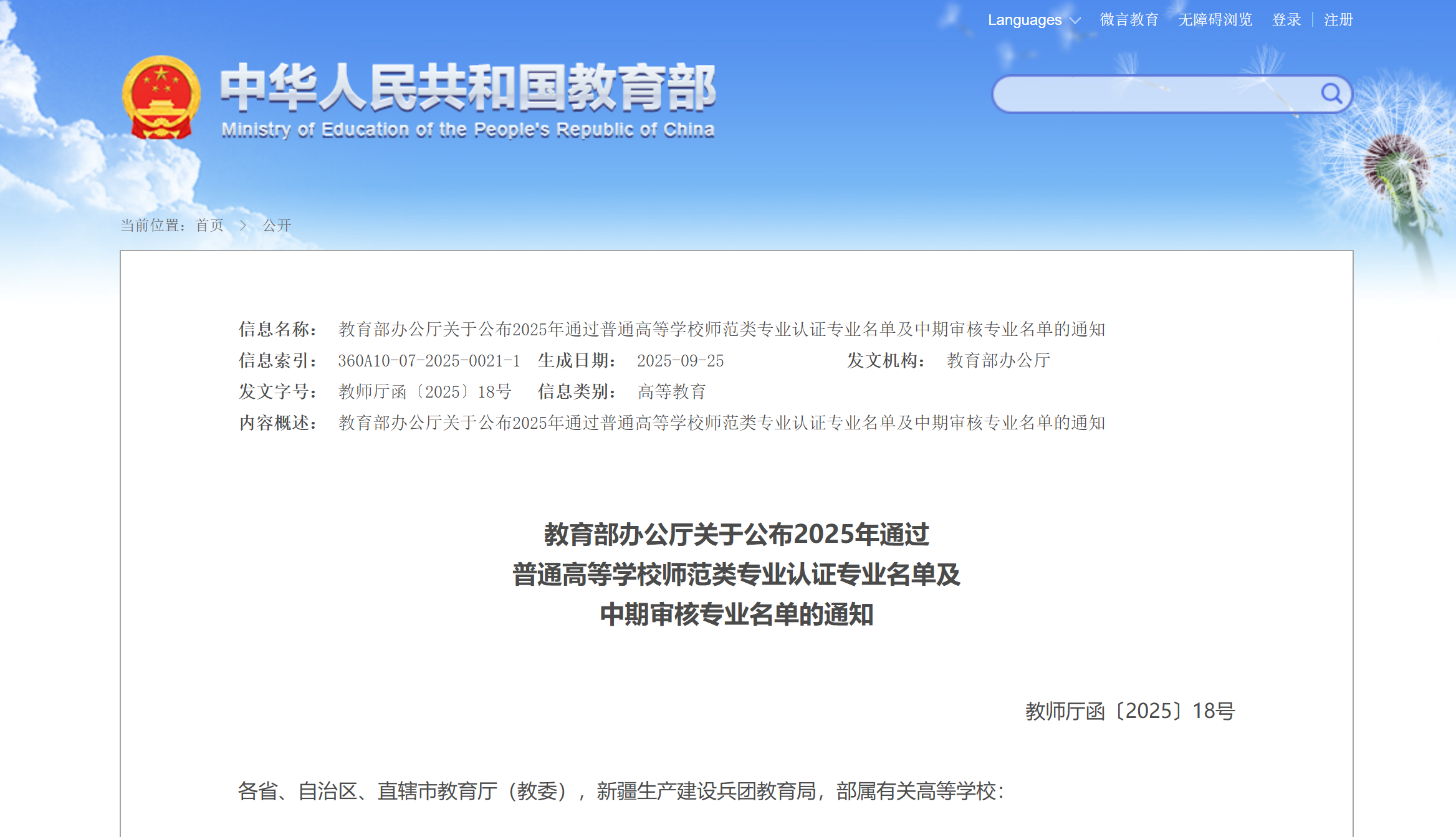 根据《中共中央 国务院关于弘扬教育家精神加强新时代高素质专业化教师队伍建设的意见》精神,按照《教育部关于印发〈普通高等学校师范类专业认证实施办法(暂行)〉的通知》(教师〔2017〕13号)要求,经高校申请、教育评估机构组织专家考查、普通高等学校师范类专业认证专家委员会审定,华东师范大学英语专业等17个专业通过第三级专业认证,中华女子学院学前教育专业等576个专业通过第二级专业认证,认证结论有效期六年,自2025年9月起至2031年8月止。经高校提交整改材料、专家审查、普通高等学校师范类专业认证专家委员会审定,北京师范大学化学专业等386个专业通过了师范类专业认证中期审核,继续保持原认证有效期。