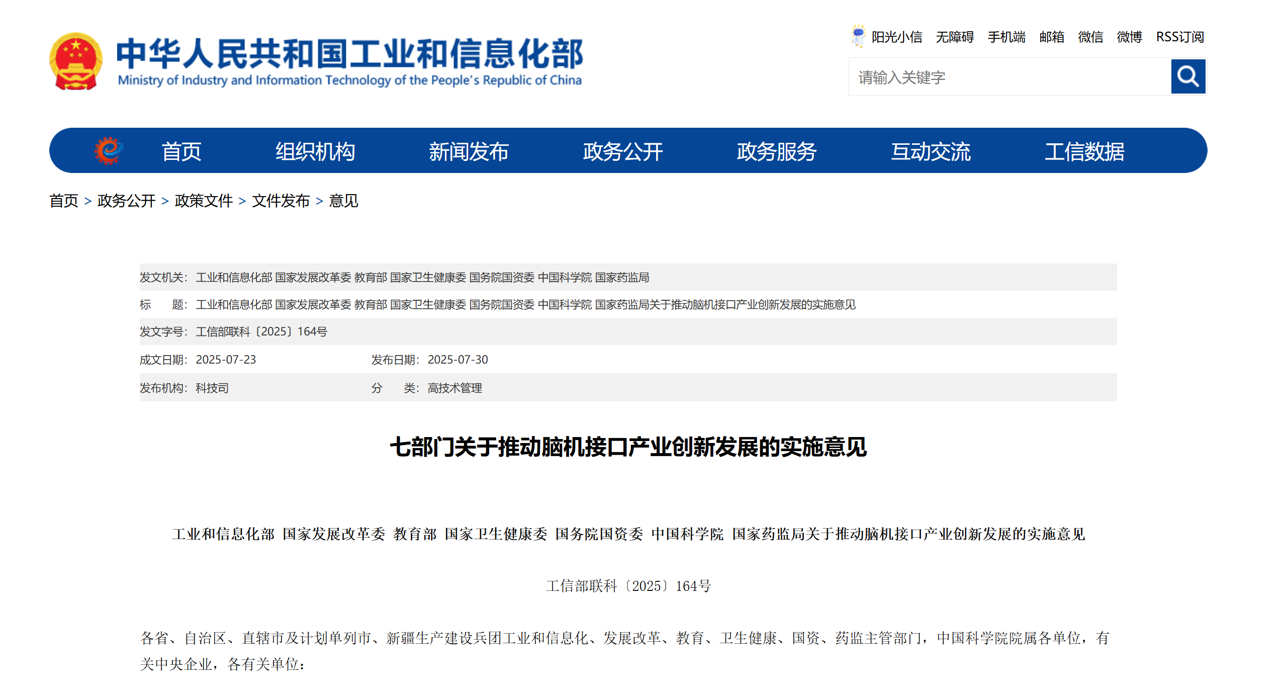 工业和信息化部 国家发展改革委 教育部 国家卫生健康委 国务院国资委 中国科学院 国家药监局关于推动脑机接口产业创新发展的实施意见
