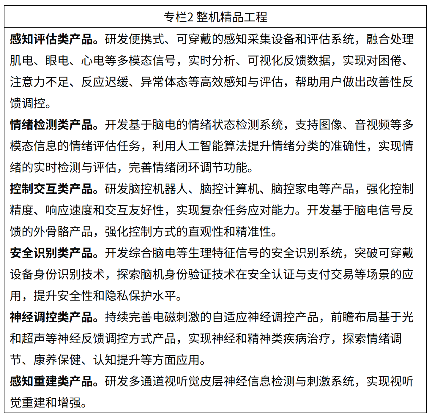 (十六)加强政策支持。加强脑机接口技术攻关和应用示范,推动布局实施一批重大项目,强化协同攻关能力。推动国家制造业转型升级基金、国家中小企业发展基金等加大投入,实施“科技产业金融一体化”专项,发挥国家产融合作平台作用,带动更多资本投入。对植入式脑机接口医疗器械等重点产品加大注册指导,给予优先支持。用好首台(套)、首批次保险补偿政策,加快产业化落地。