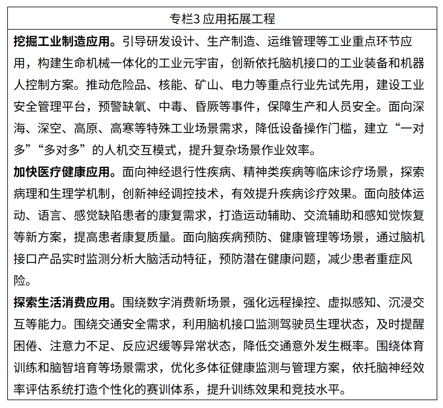 (十)完善创新载体。支持建设国家制造业创新中心、国家技术创新中心、国家新兴产业创新中心、国家产业技术工程化中心、全国重点实验室、国家临床医学研究中心,凝聚产学研各界优势力量,提升脑机接口关键共性技术供给能力。依托产业联盟、行业协会等组织,促进脑机接口技术交流、供需对接、国际合作,深化创新链产业链资金链人才链融合。建设开源社区,加强对重点开源项目的支持力度,汇聚全球开发者协同创新。