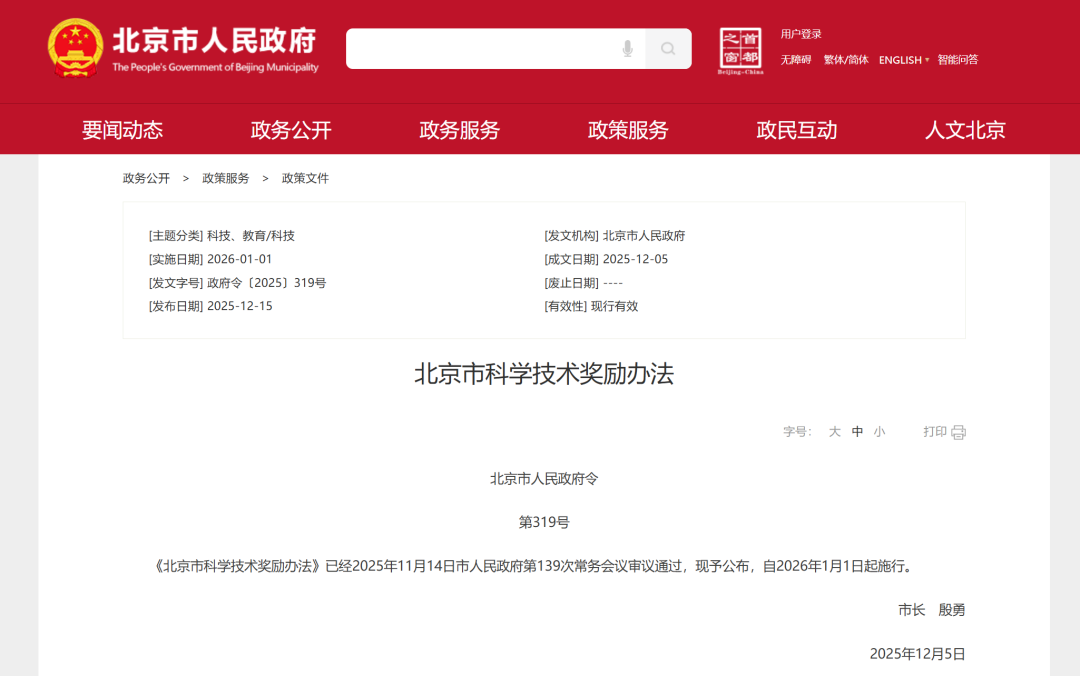 日前,北京市人民政府第319号令公布,《北京市科学技术奖励办法》已经2025年11月14日市人民政府第139次常务会议审议通过,将于2026年1月1日起施行。