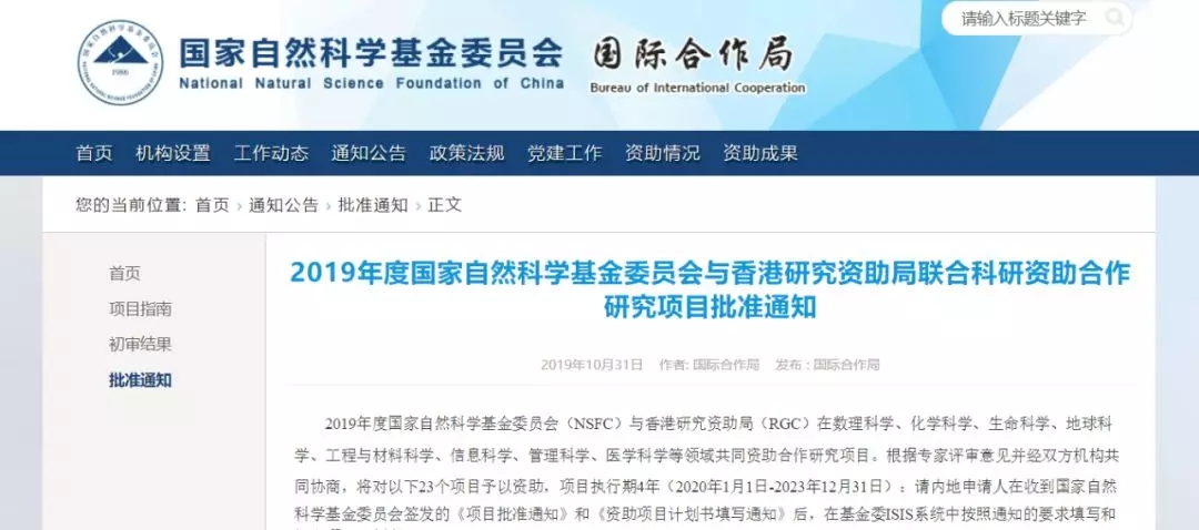 日前,国家自然科学基金委员会、港澳台事务办公室联合印发通知,正式对外发布了“2019年度国家自然科学基金委员会与香港研究资助局联合科研资助合作研究项目”(以下简称“联合资助合作项目”)名单。
