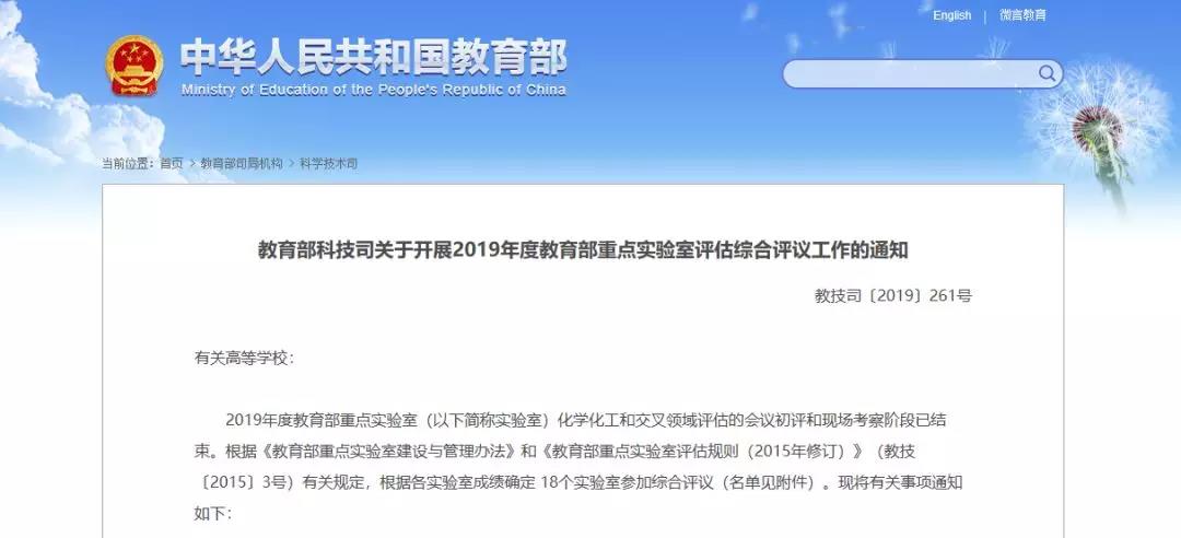 日前,教育部科技司以通知的形式,发布了2019年度教育部重点实验室(化学化工和交叉领域)评估综合评议名单。据统计,本次共有17所高校的18个实验室进入综合评议环节。