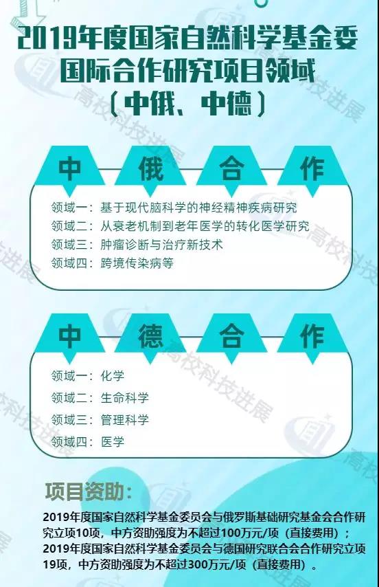 另据高校科技进展(公众号:gxkjjz)观察,2020年度国家自然科学基金委与德国研究联合会合作研究项目申报已开始,资助领域为数理科学、地球科学、工程与材料科学、信息科学,中方资助强度为不超过300万元/项。截至目前,2020年度国家自然科学基金委与俄罗斯有关方面合作研究项目的相关申报文件,暂未见发布。