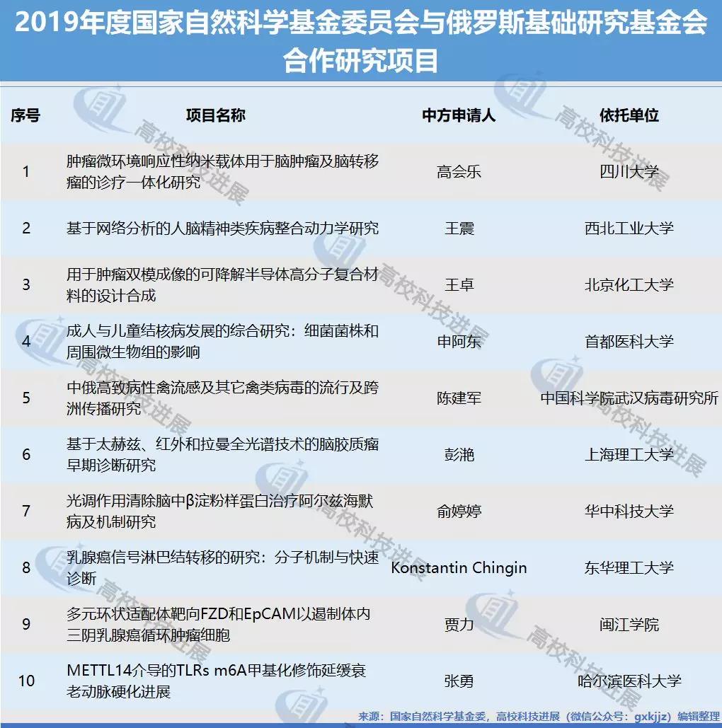 在获批的中俄合作研究项目中,四川大学、西北工业大学、北京化工大学、首都医科大学、上海理工大学、华中科技大学、东华理工大学、闽江学院、哈尔滨医科大学等9所高校分别有1个申报项目获得批准;中国科学院研究单位获得批准项目1个。按照资助强度为不超过100万元/项的标准,高校本次共获得国家自然科学基金委经费资助预计将达到900万元。
