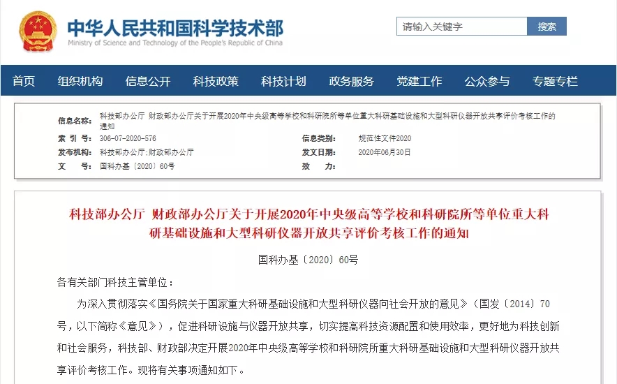 6月30日,科技部、财政部联合印发《关于开展2020年中央级高等学校和科研院所等单位重大科研基础设施和大型科研仪器开放共享评价考核工作的通知》,决定对中央级高校和科研院所等单位拥有的重大科研基础设施,以及原值50万元以上的大型科研仪器2019年度开放共享情况进行评价考核。