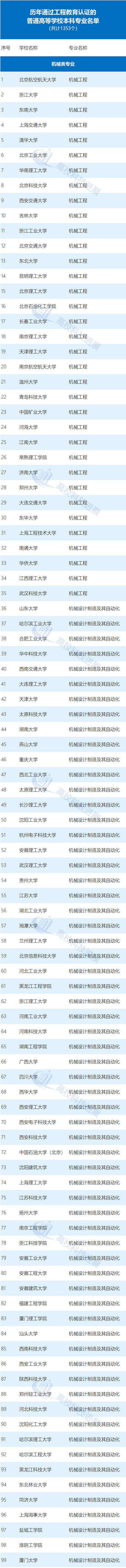 日前,教育部高等教育教学评估中心会同中国工程教育专业认证协会发布历年来通过工程教育认证的工科专业名单。数据显示,截至2019年年底,全国共有241所普通高等学校1353个专业通过了工程教育认证,涉及机械、仪器等21个工科专业类。