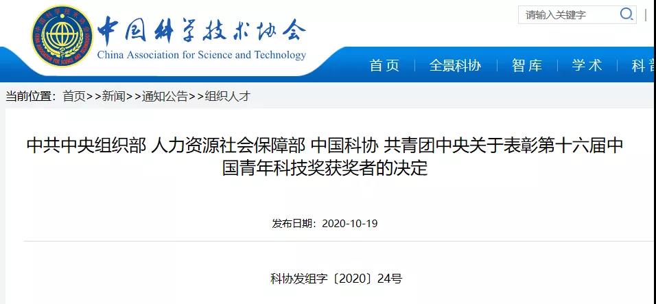 10月19日,中国科协门户网站公布了《关于表彰第十六届中国青年科技奖获奖者的决定》(科协发组字〔2020〕24号,简称《决定》)。根据《决定》发布的获奖名单显示,共有100位杰出青年科学家被授予中国青年科技奖,其中,10人被授予“中国青年科技奖特别奖”。