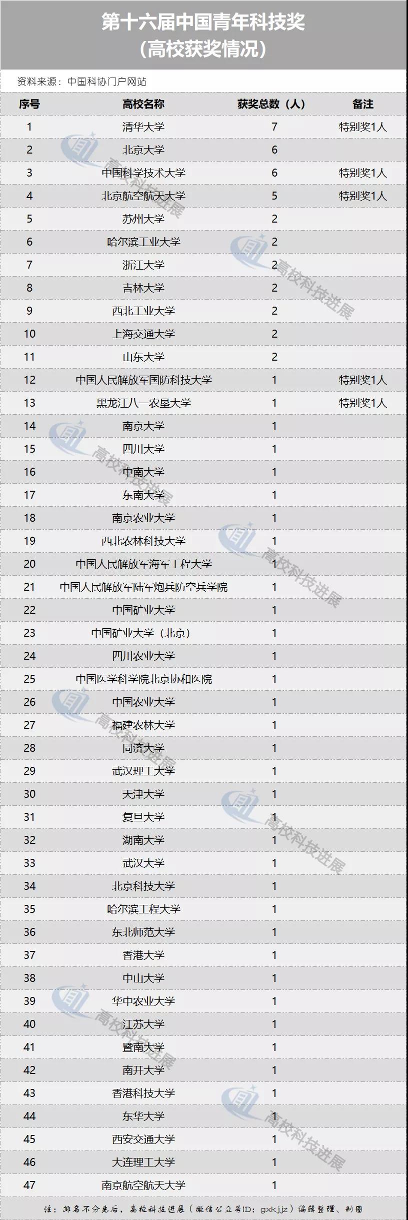 附:第十六届青年科技奖高校获奖情况统计