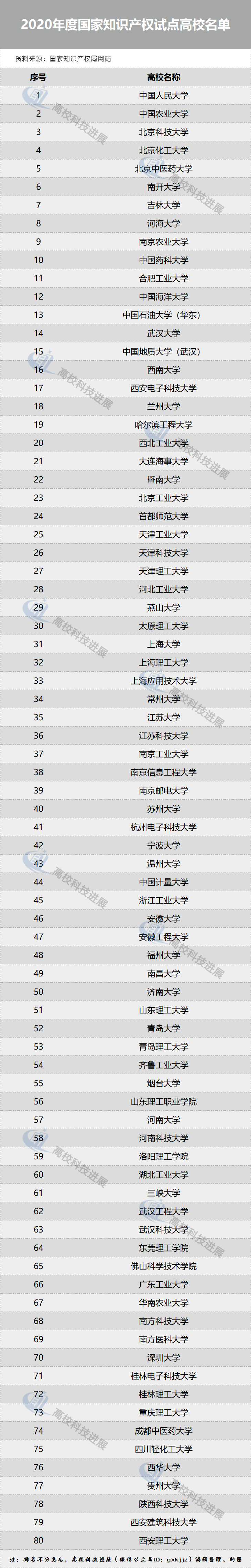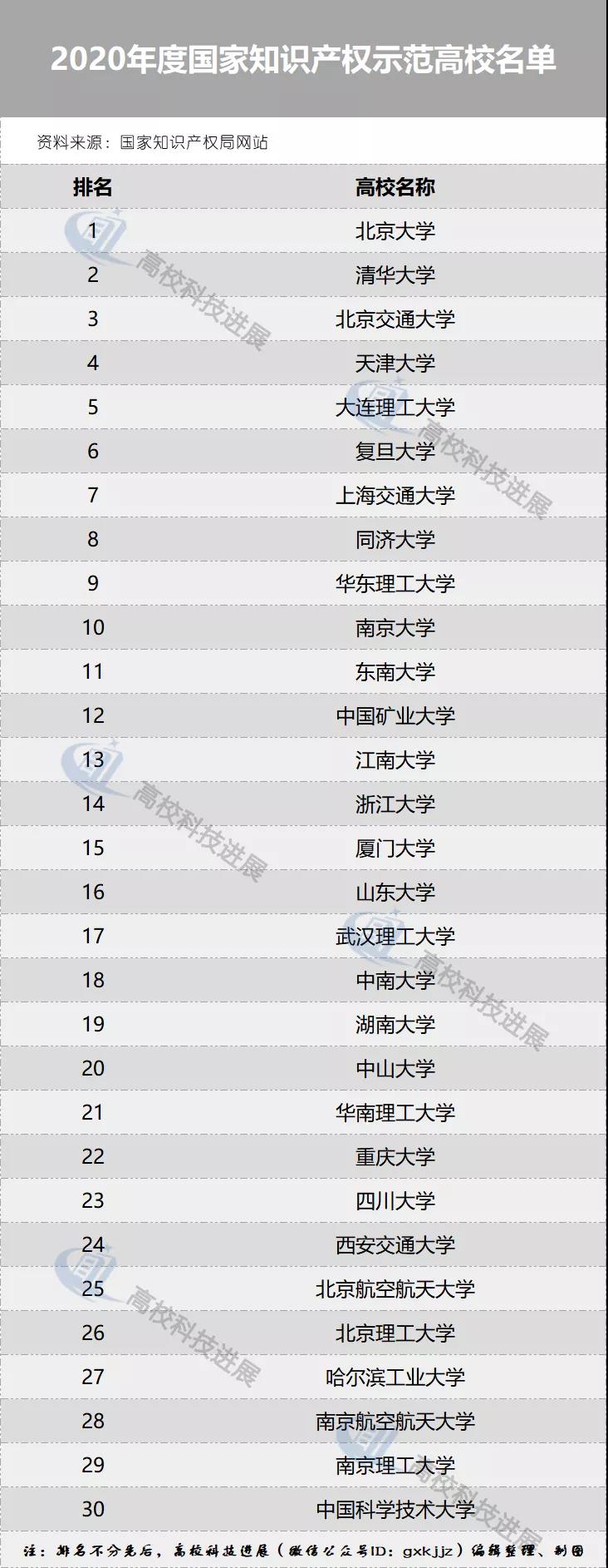 高校科技进展10月22日从国家知识产权局网站获悉,国家知识产权局、教育部日前联合印发通知(国知发运字〔2020〕40号),正式公布了2020年度国家知识产权试点示范高校名单。