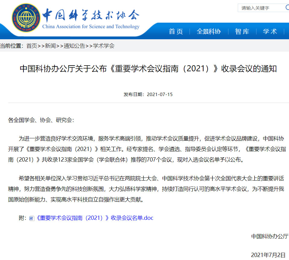 近日,中国科协办公厅公布《重要学术会议指南(2021)》收录会议名单,共收录123家全国学会(学会联合体)推荐的707个重要学术会议,包括545个国内会议和162个国际会议。