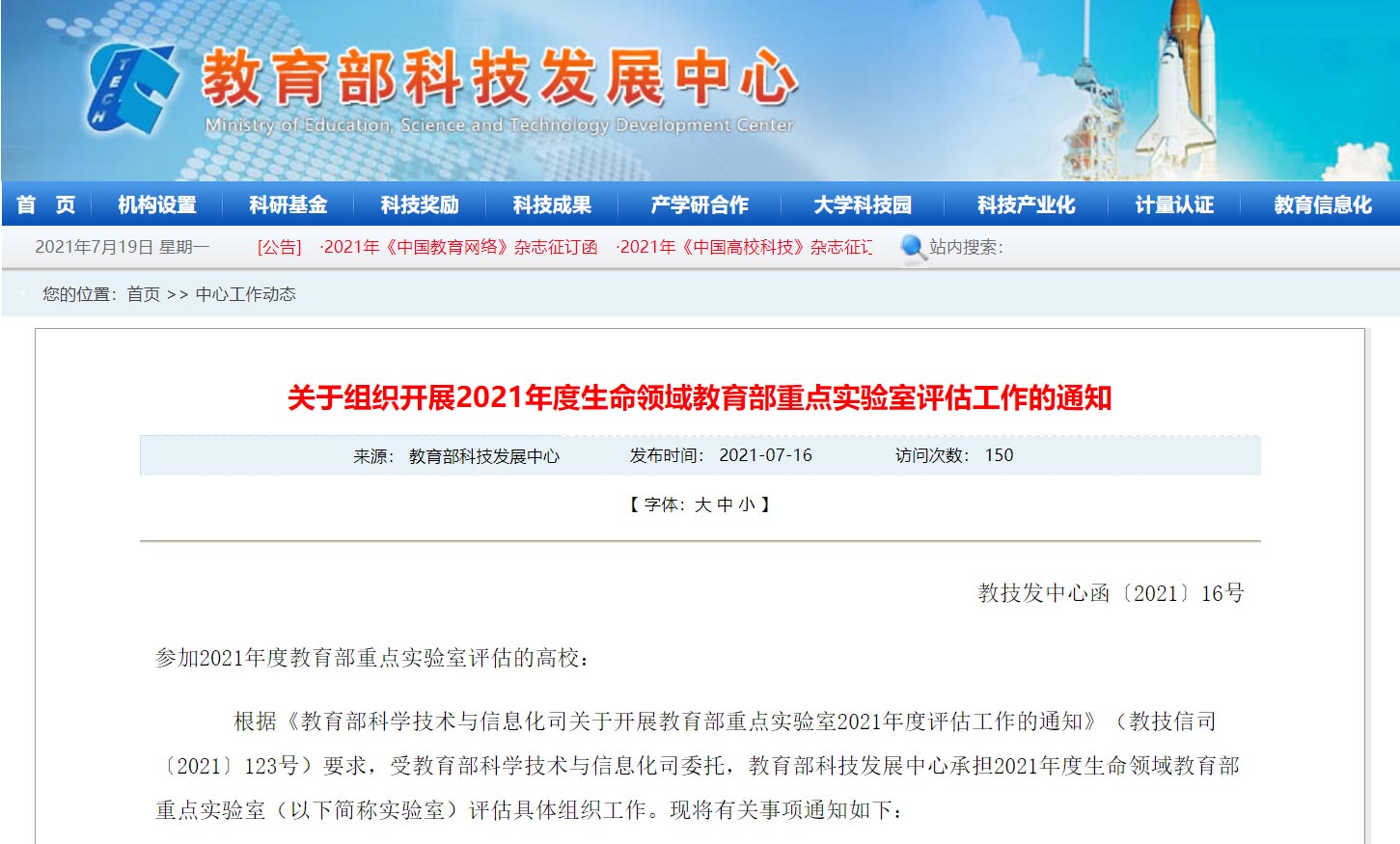 7月16日,教育部科技发展中心网站发布通知,组织开展2021年度生命领域教育部重点实验室评估工作。