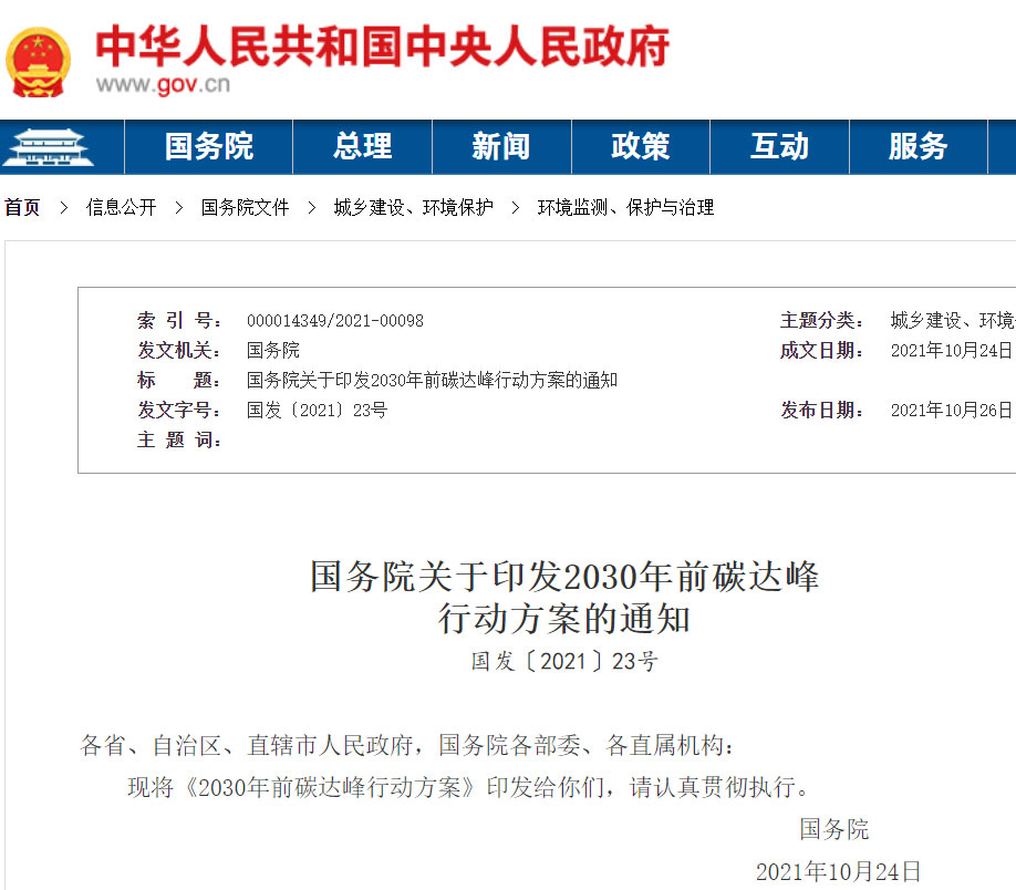 近日,国务院印发《2030年前碳达峰行动方案》(以下简称《方案》)。《方案》提出,到2025年,非化石能源消费比重达到20%左右,单位国内生产总值能源消耗比2020年下降13.5%,单位国内生产总值二氧化碳排放比2020年下降18%,为实现碳达峰奠定坚实基础。到2030年,非化石能源消费比重达到25%左右,单位国内生产总值二氧化碳排放比2005年下降65%以上,顺利实现2030年前碳达峰目标。