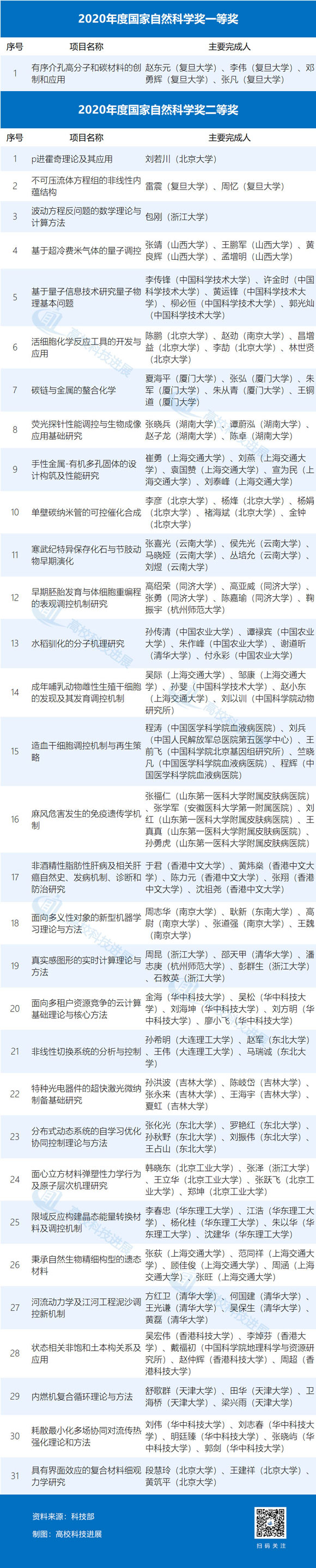 其中,高校作为第一完成人所在单位获得2020年度国家自然科学奖一等奖1项、二等奖31项,占授奖项目总数46项(一等奖2项,二等奖44项)的69.6%。