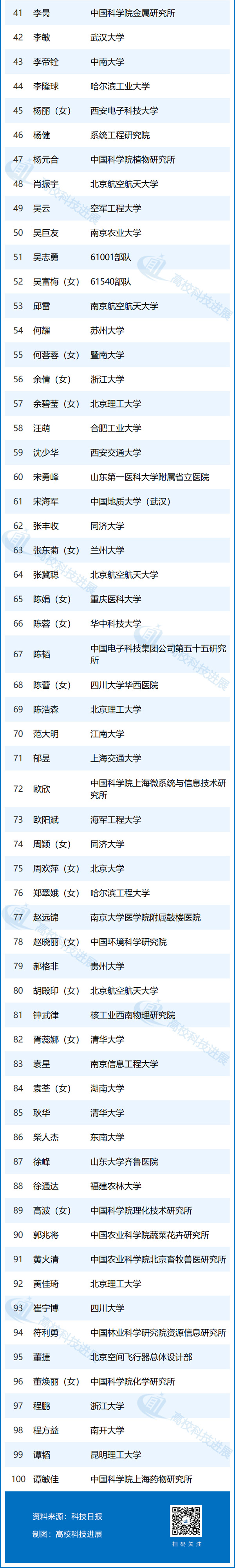 值得一提的是,在非“双一流”高校中,昆明理工大学、福建农林大学、山东农业大学、浙江农林大学、山东第一医科大学、重庆医科大学、北京农学院等,也均有1人入选。