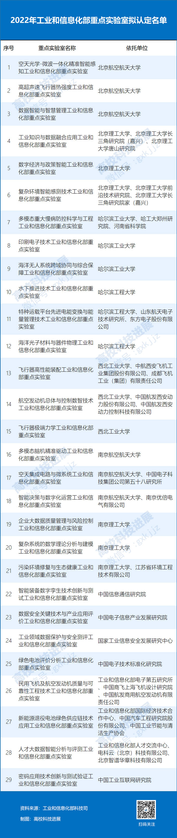 近日,工业和信息化部发布《2022年工业和信息化部重点实验室拟认定名单公示》,共有29个重点实验室入选。