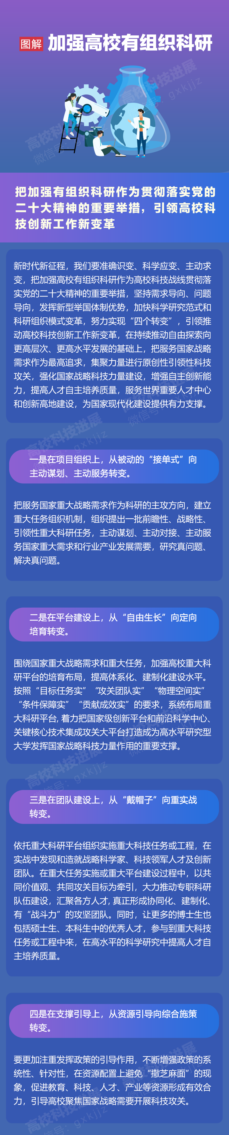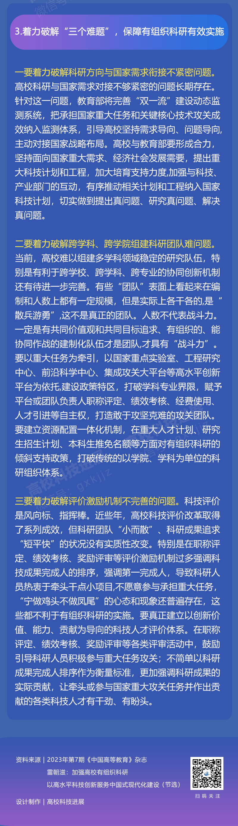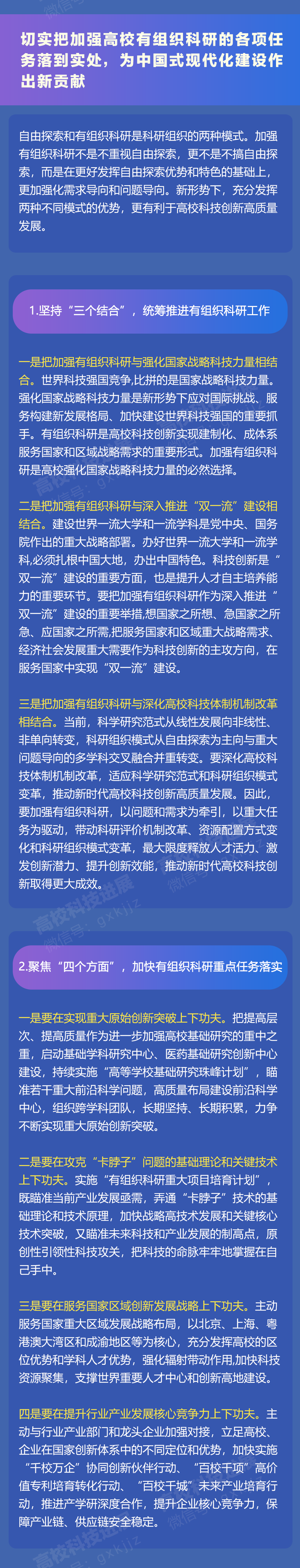 文章提到,新时代新征程,我们要准确识变、科学应变、主动求变,把加强高校有组织科研作为高校科技战线贯彻落实党的二十大精神的重要举措,坚持需求导向、问题导向,发挥新型举国体制优势,加快科学研究范式和科研组织模式变革,努力实现“四个转变”,引领推动高校科技创新工作新变革,在持续推动自由探索向更高层次、更高水平发展的基础上,把服务国家战略需求作为最高追求,集聚力量进行原创性引领性科技攻关,强化国家战略科技力量建设,增强自主创新能力,提高人才自主培养质量,服务世界重要人才中心和创新高地建设,为国家现代化建设提供有力支撑。