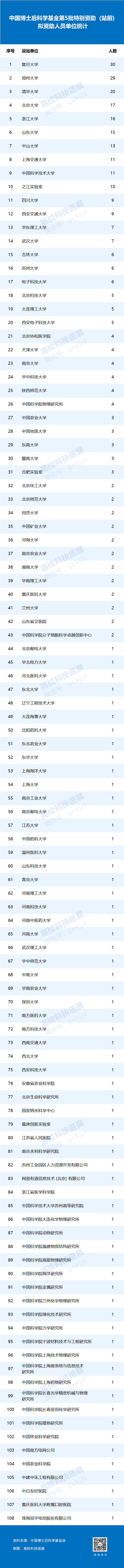 中国博士后科学基金第5批特别资助(站前)拟资助人员中,复旦大学拟资助30人,郑州大学29人,清华大学20人,北京大学17人,浙江大学16人,山东大学、中山大学、上海交通大学、中国科学技术大学、之江实验室拟资助人数均在10人及以上。
