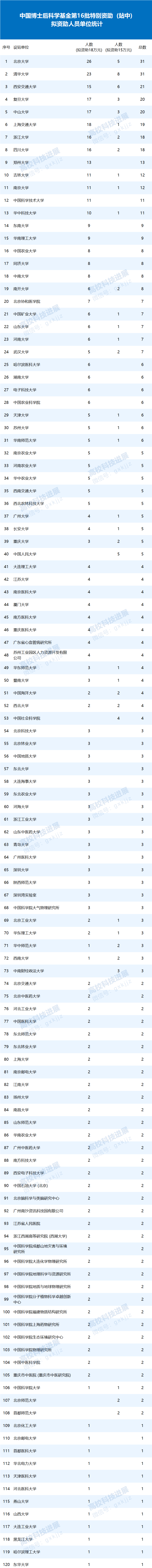 中国博士后科学基金第16批特别资助(站中)拟资助人员中,北京大学和清华大学拟资助总人数各31人,西安交通大学21人,复旦大学和中山大学各20人,上海交通大学19人,浙江大学和四川大学分别18人,郑州大学、吉林大学、南京大学、中国科学技术大学和华中科技大学拟资助总人数均在10人以上。