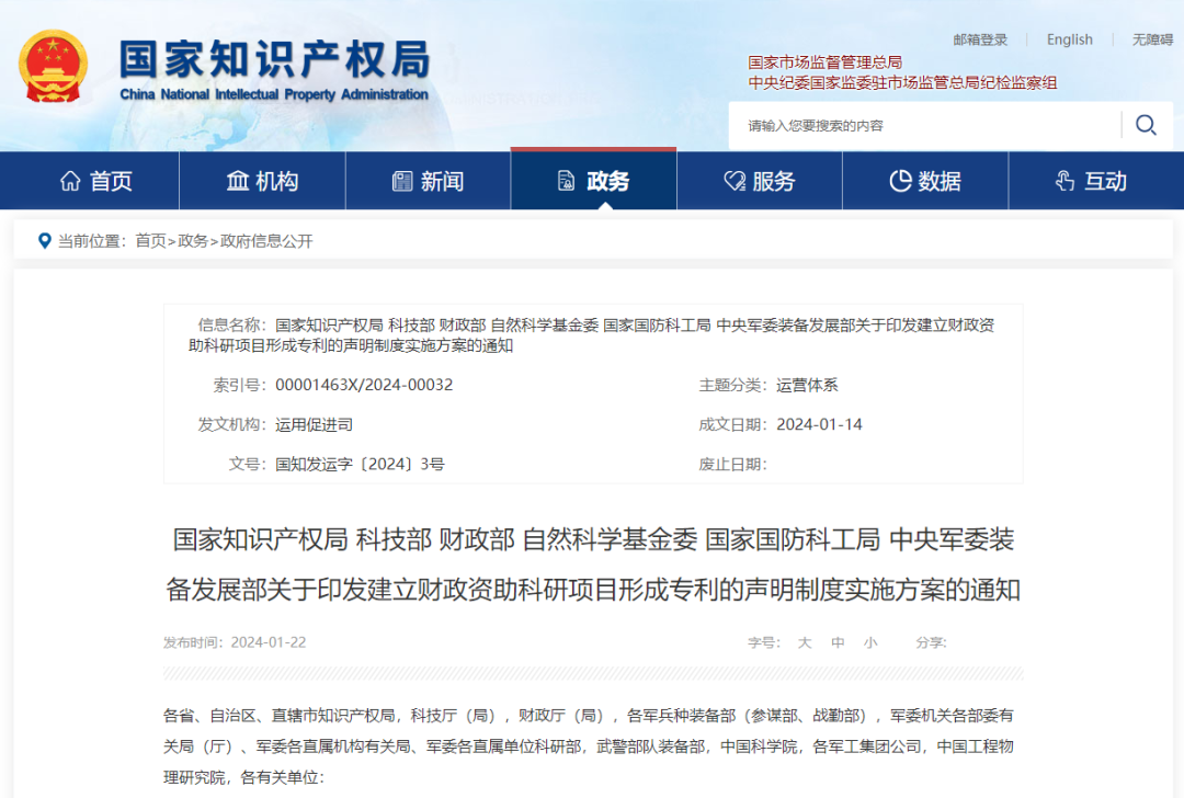 近日,国家知识产权局联合科技部、财政部、自然科学基金委、国家国防科工局和中央军委装备发展部印发《建立财政资助科研项目形成专利的声明制度实施方案》(以下简称《实施方案》)。